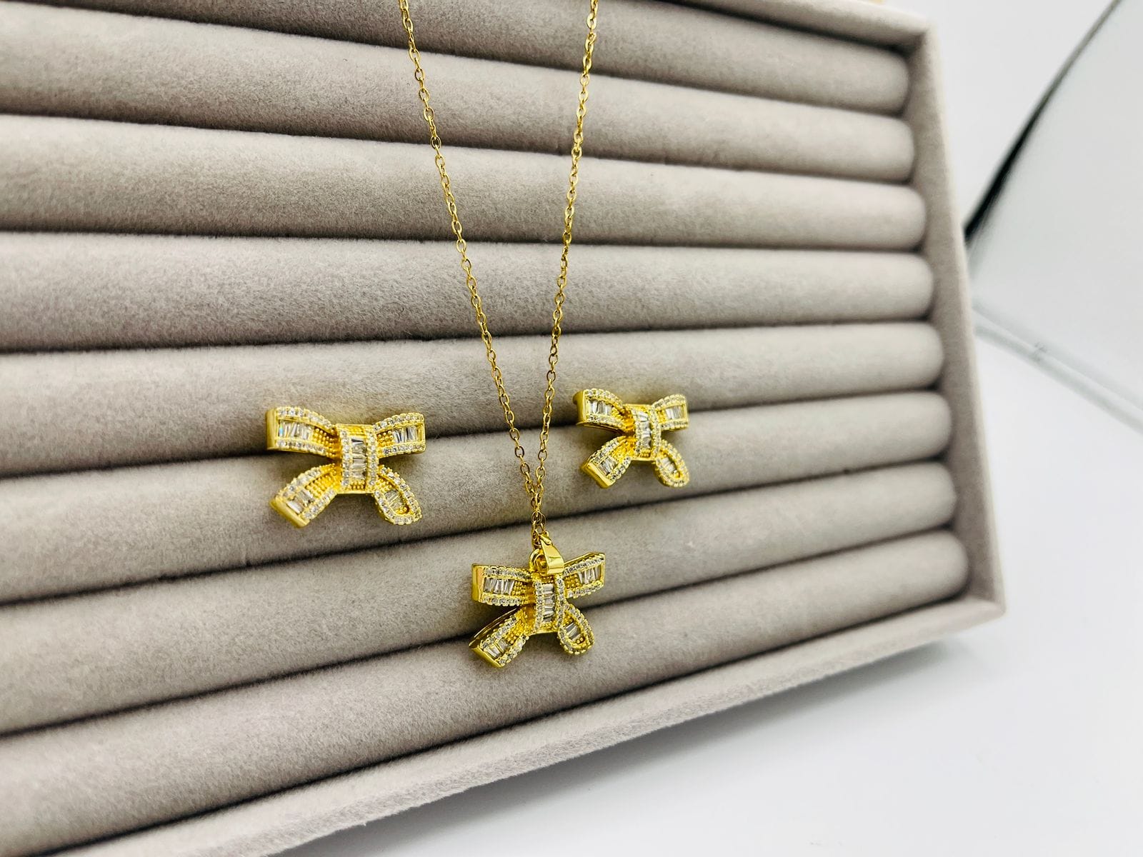 Add to cartA striking gold jewelry set with a bow motif enhanced by sparkling embellishments, adding a glamorous touch.