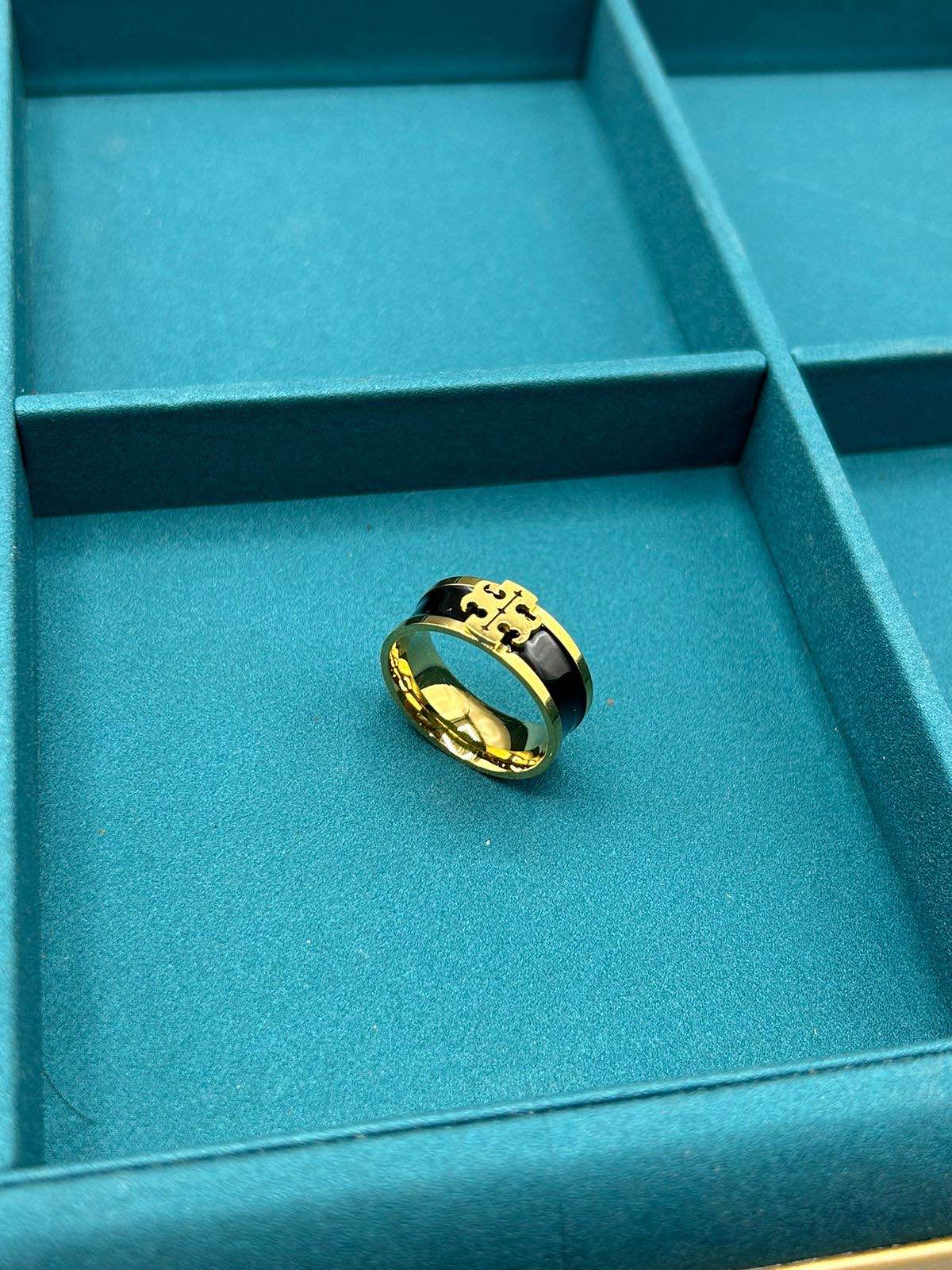 This stylish ring features a bold double T logo, showcasing a modern and sophisticated design. The gold-tone band adds a touch of luxury, making it a statement piece for any occasion.