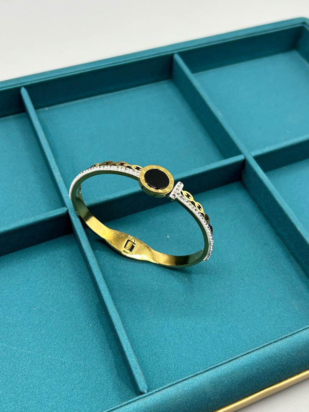 This sophisticated bangle features a sleek gold-tone finish with a striking black disc accent. The chain detail adds a touch of texture and movement, making it a stylish and versatile accessory.