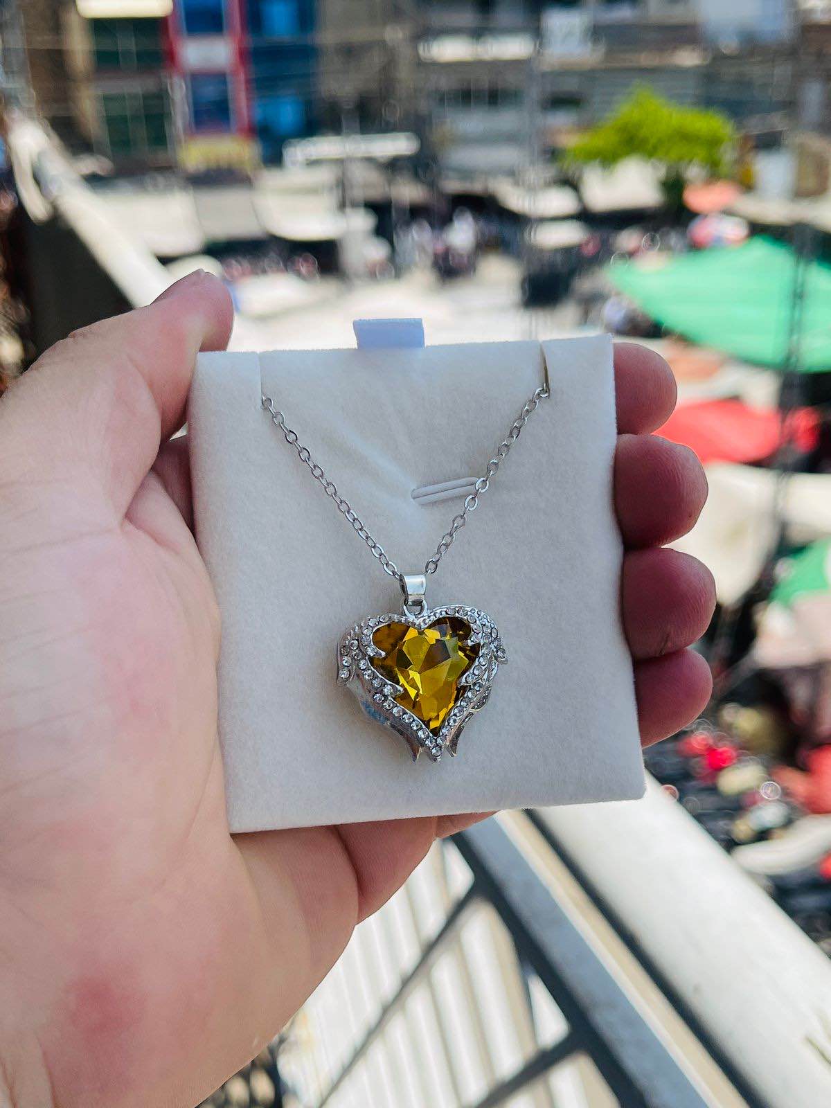 This stunning necklace features a heart-shaped pendant with a dazzling golden stone, framed by delicate wings. The pendant is perfect for adding a touch of elegance and sparkle to any outfit.