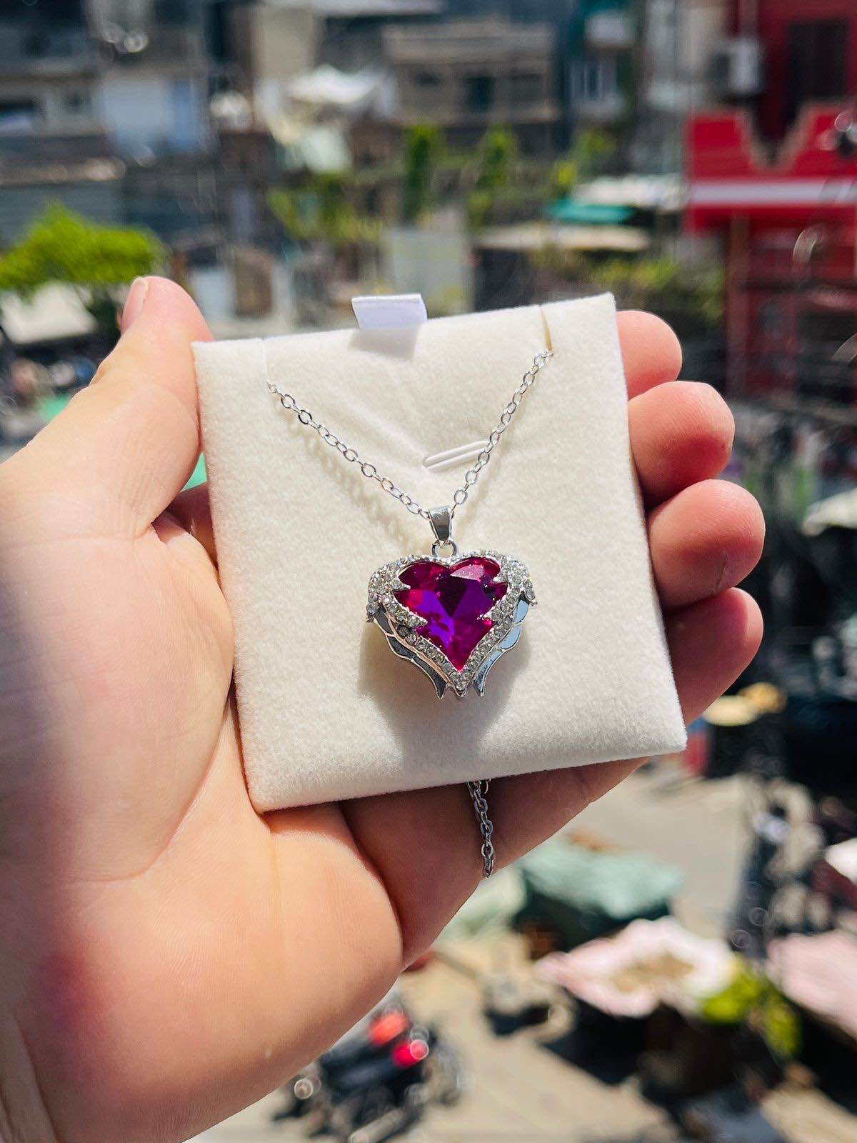 This stunning necklace features a heart-shaped pendant with a mesmerizing ruby-colored stone, framed by delicate wings. The pendant is perfect for adding a touch of elegance and sparkle to any outfit.