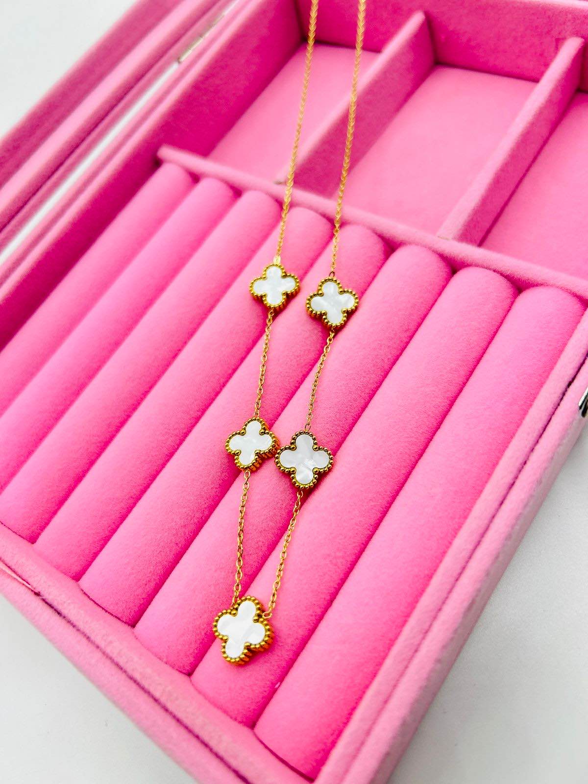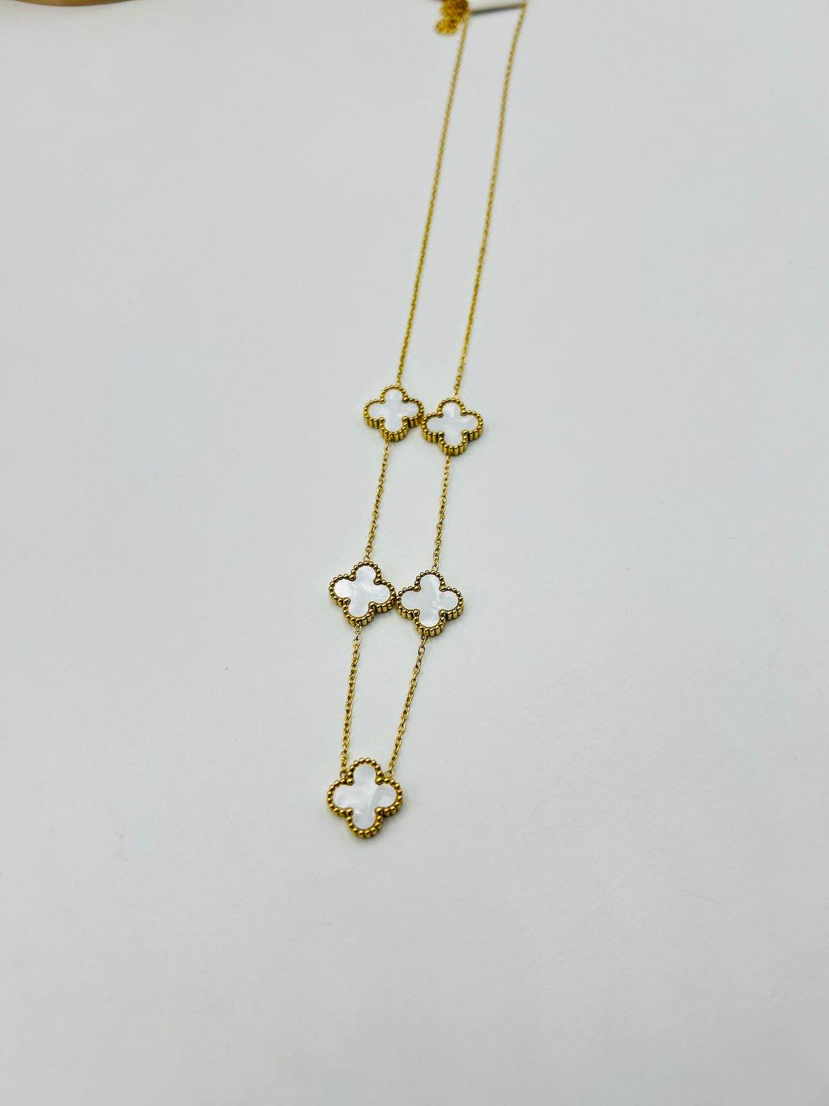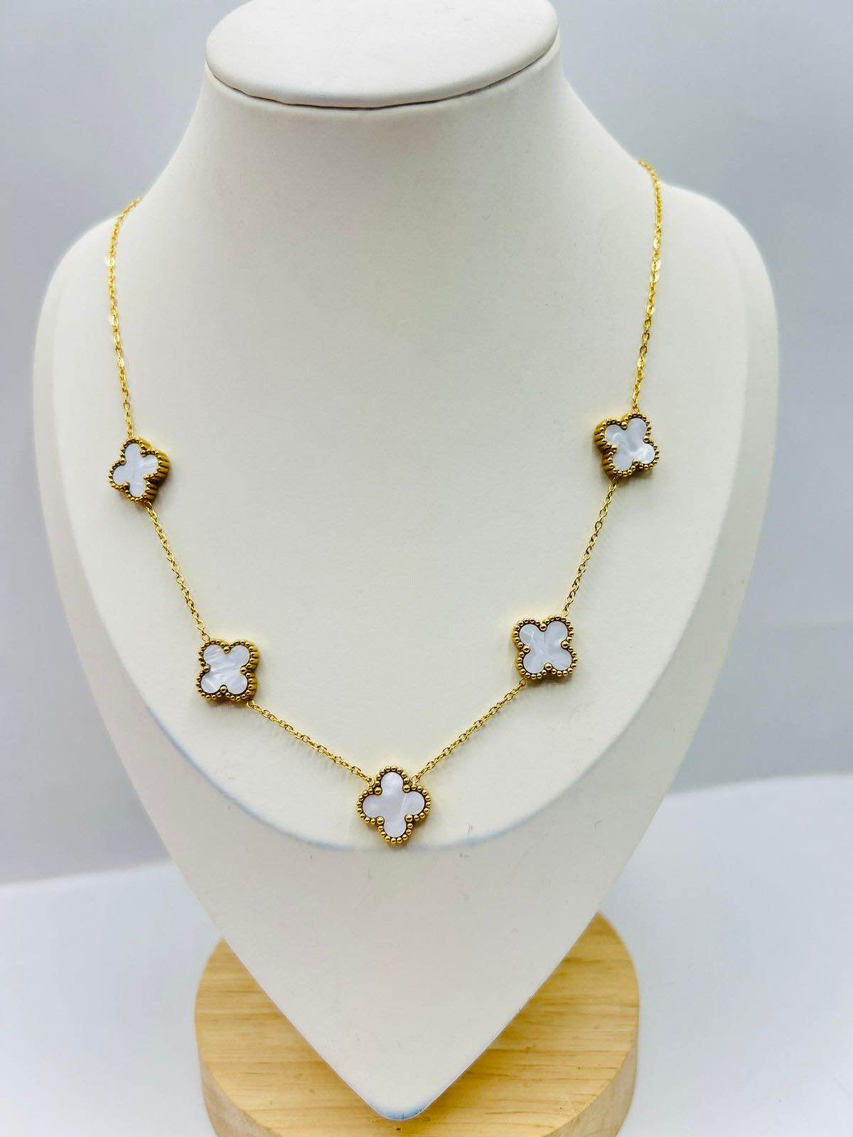 This minimalist necklace features a delicate chain with white clover charms, creating a simple yet stylish look.