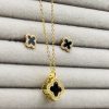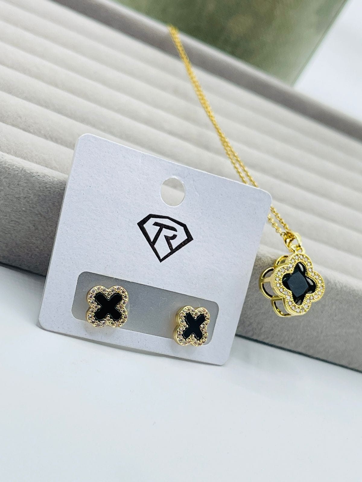 A touch of timeless eleganA sophisticated gold-plated necklace and earrings set with black clover-shaped pendants, offering a bold and timeless charm.ce. This dazzling necklace and earring set features a classic clover design with sparkling stones, adding a touch of glamour to any outfit.